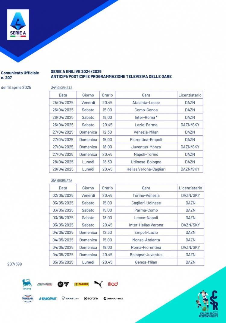 直播吧4月18日讯 意甲官方更新社媒动态,公布了意甲第34轮、第35轮比赛的开球时间(北京时间)。
