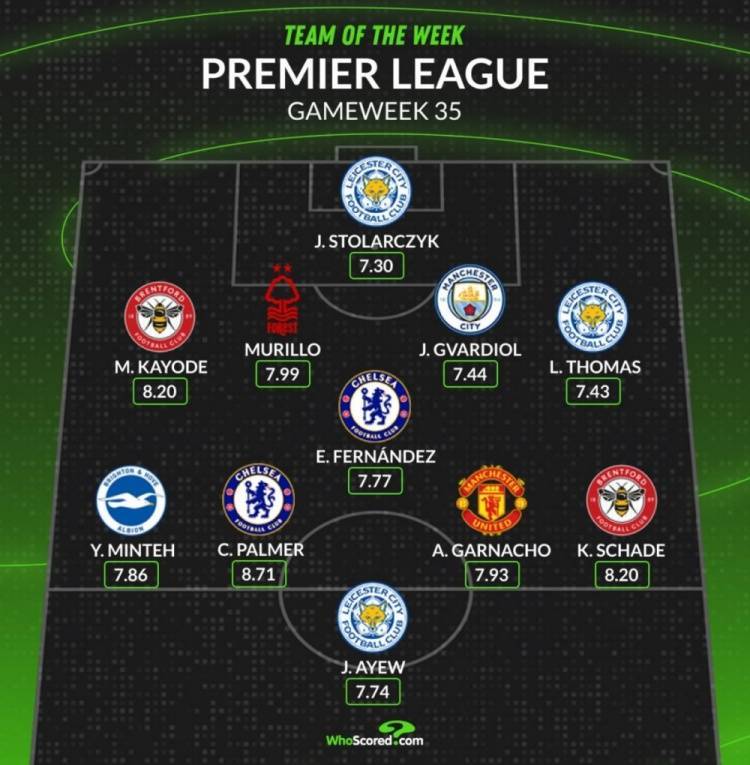 直播吧5月6日讯 英超第35轮战罢,数据网站Whoscored也盘点了本轮比赛评分最高阵容,其中加纳乔、恩佐等在列,具体如下: