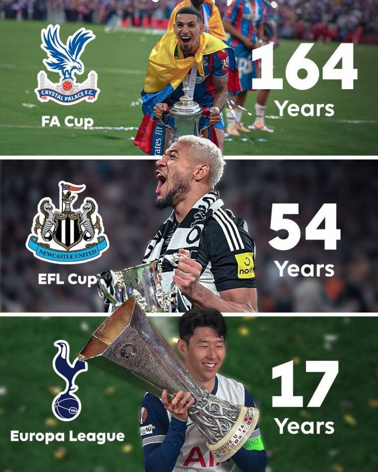 英超联赛官推晒出海报,向水晶宫、纽卡和热刺送上祝贺:“这是一个终结冠军荒的赛季!对于水晶宫、纽卡和热刺而言,他们等待冠军奖杯很久很久了。”