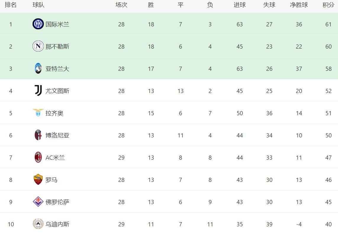 在积分榜上,国际米兰以61分排名榜首。那不勒斯60分紧随其后。第3的是亚特兰大,拿到58分。尤文图斯52分排名第4。拉齐奥51分排名第5。第6的是博洛尼亚,拿到50分。AC米兰这轮赢球之后,总积分达到47分,暂时超越了罗马,升到第7名。少赛一轮的罗马以46分排名第8。
